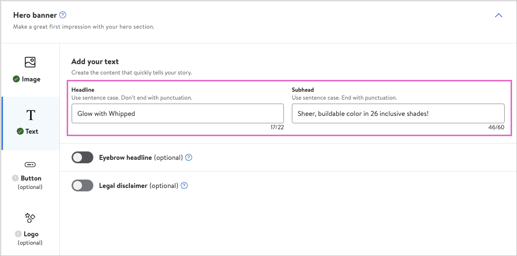 这部分必须填写Hero banner的标题(品牌或活动的主题与优惠)、副标题(与标题相关的 其他详细信息),可选择填写眉题与法律免责声明。