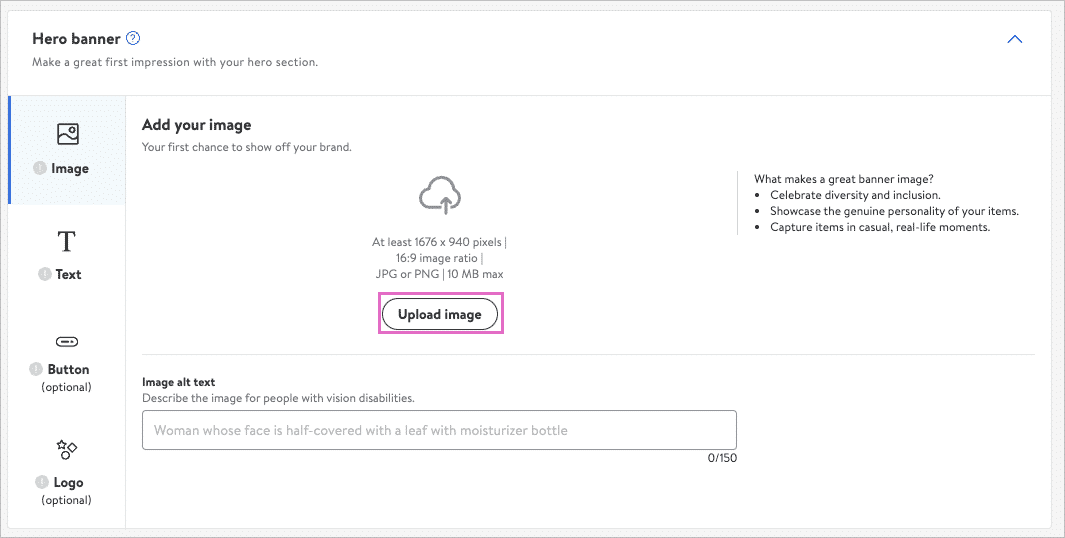 最后,Hero banner建议展示品牌logo,加深顾客对本品牌的印象。Logo图片比例必须为1:1,尺寸至少是240x240,大小不超过10MB,具有透明背景的PNG格式。上传logo图片后可选择“Replace image”替换或者“Remove image”移除。