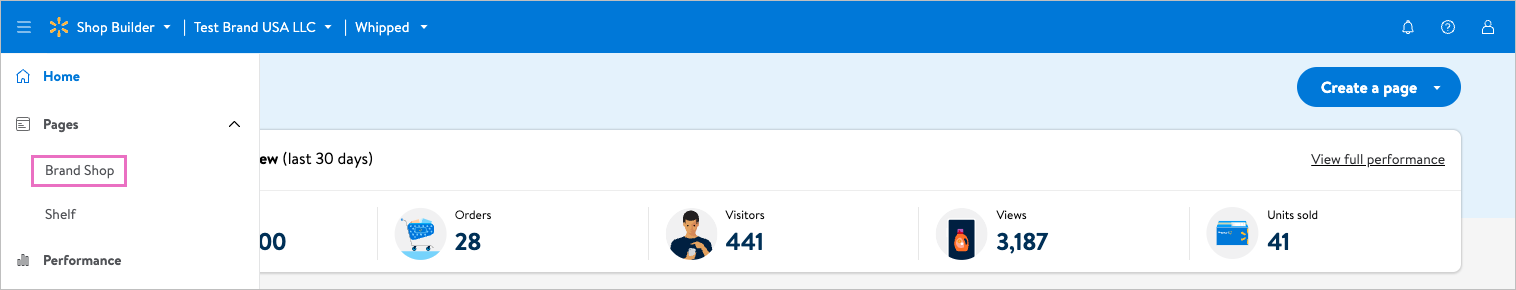 (1)直接在该页面右上角点击Create a page > Brand Shop。
