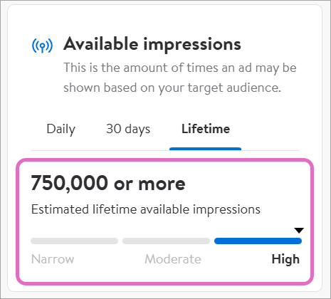 3)填写以上信息后,系统将自动预测该广告组设置下的每日曝光范围,其中Narrow代表0-10000次曝光,Moderate代表10001-100000次曝光,High代表100000+曝光。