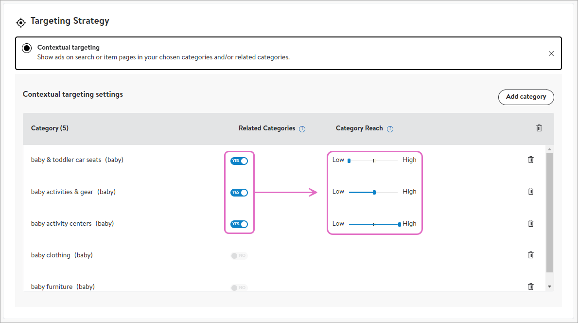 只有在沃尔玛扩展模型判定一些品类拥有高度相关的相关品类时才会启用Related categories功能,此时可以通过调节“Category Reach”滑块控制扩展品类的触达范围,建议在Awareness阶段设置触达范围为“High”,Consideration与Conversion阶段设置触达范围为“Medium”或“Low”