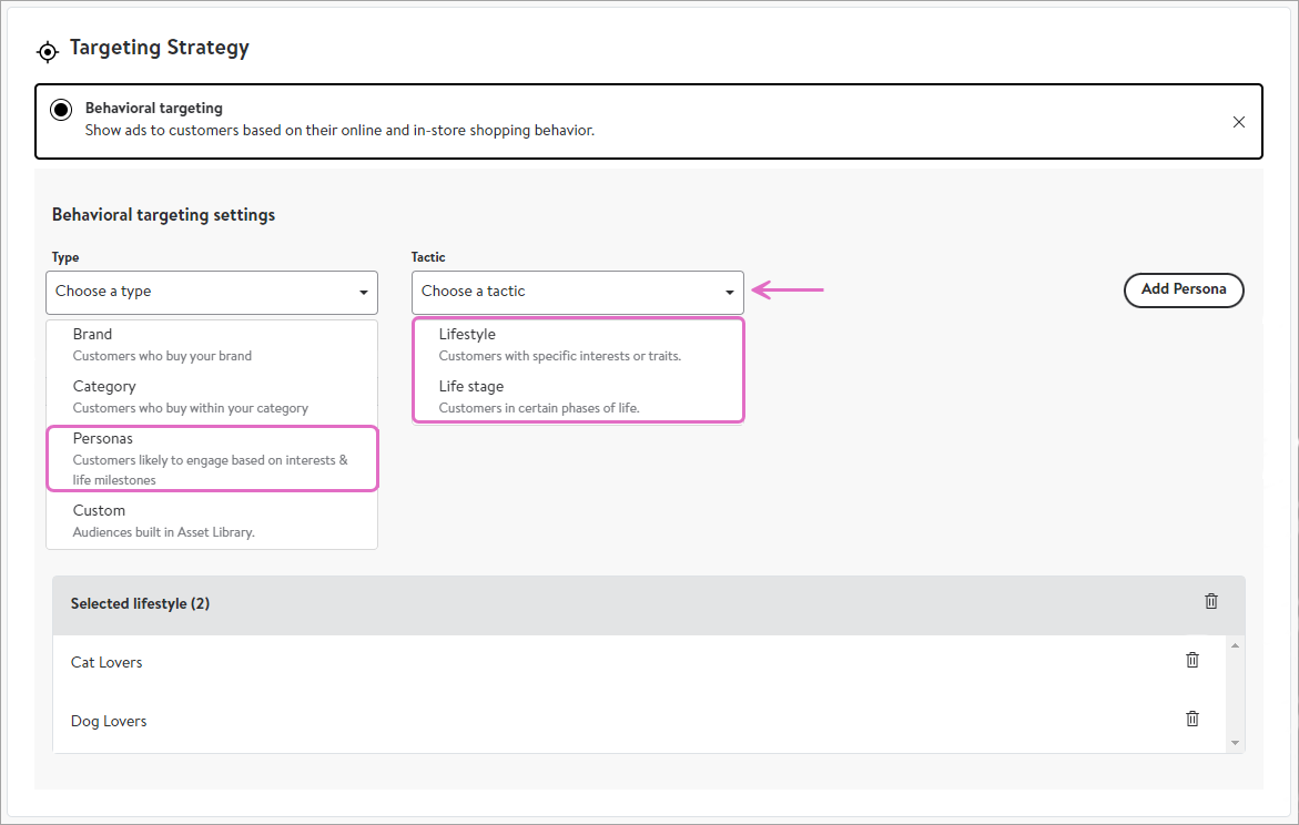 在Type里选择“Personas”,Tactic选择对应受众,并添加可用的人群标签。