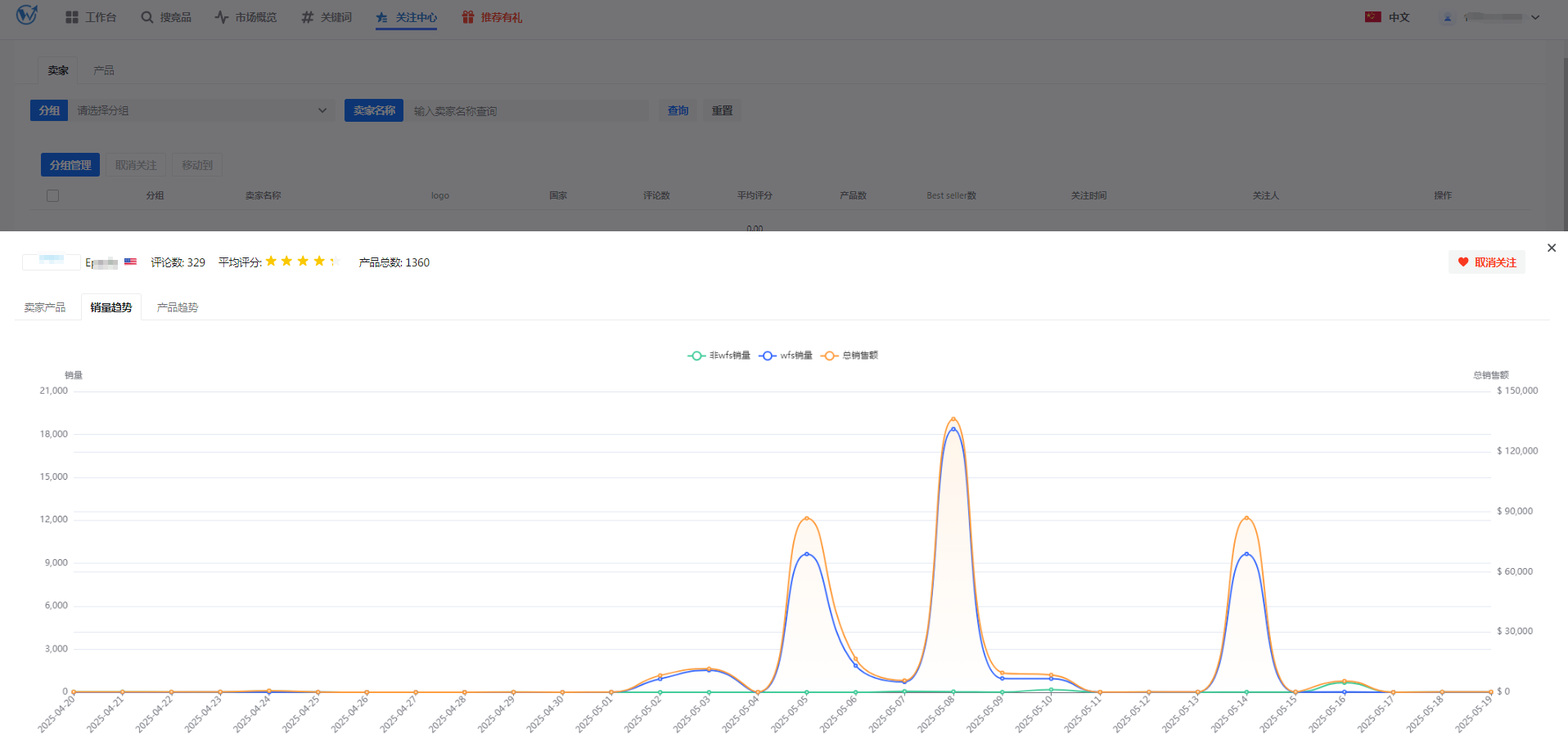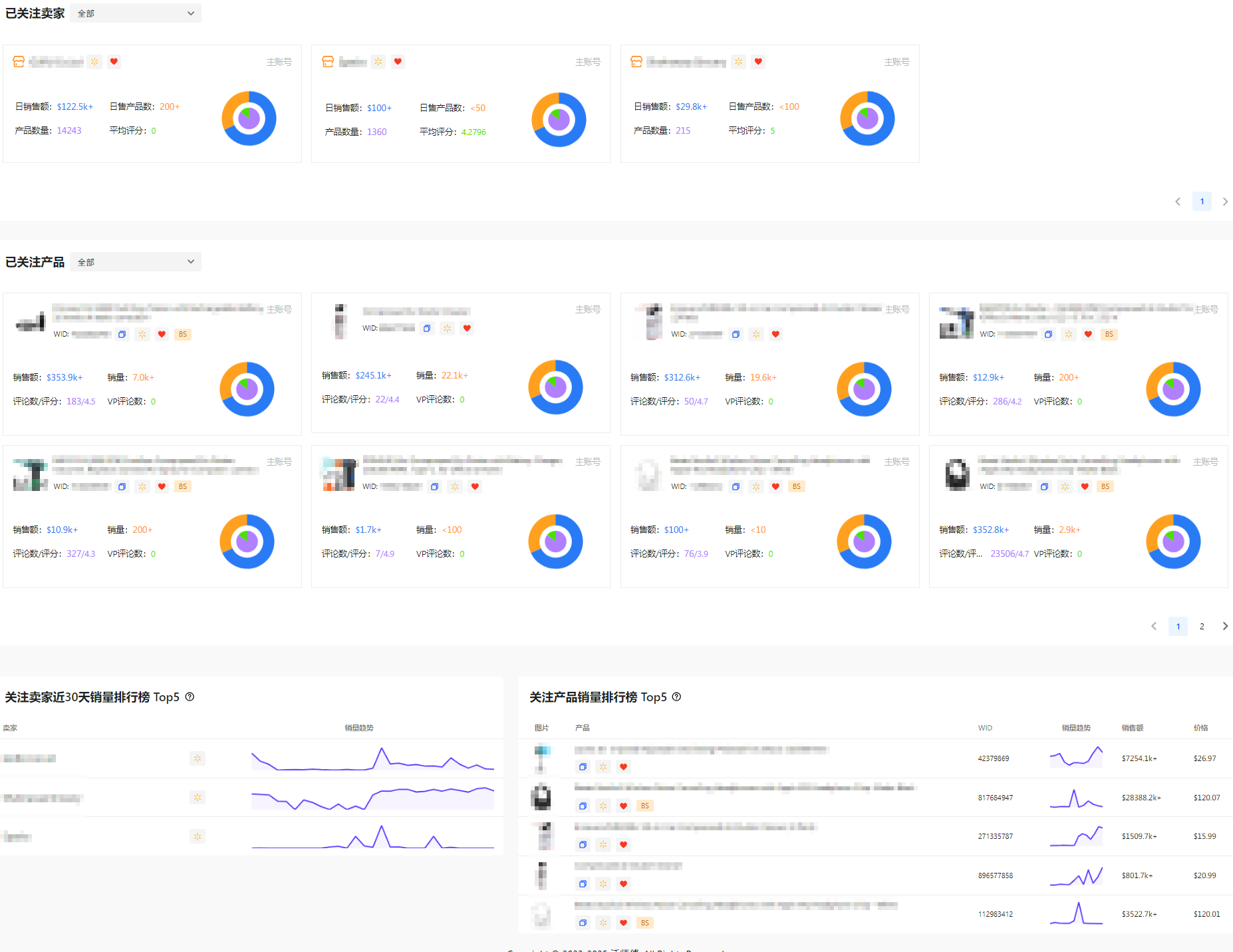 包含已关注卖家、已关注产品、关注卖家近30天销量排行榜Top5、关注产品销量排行榜Top5。