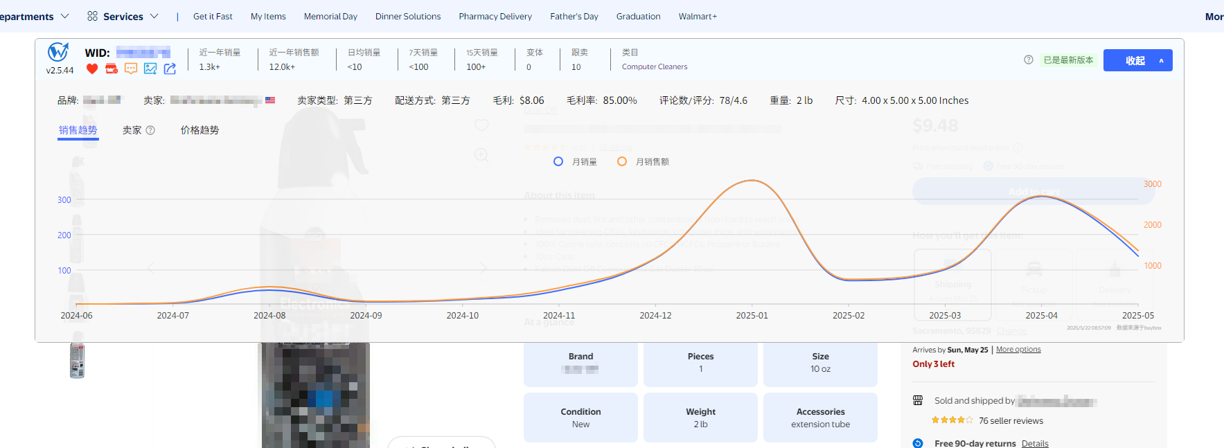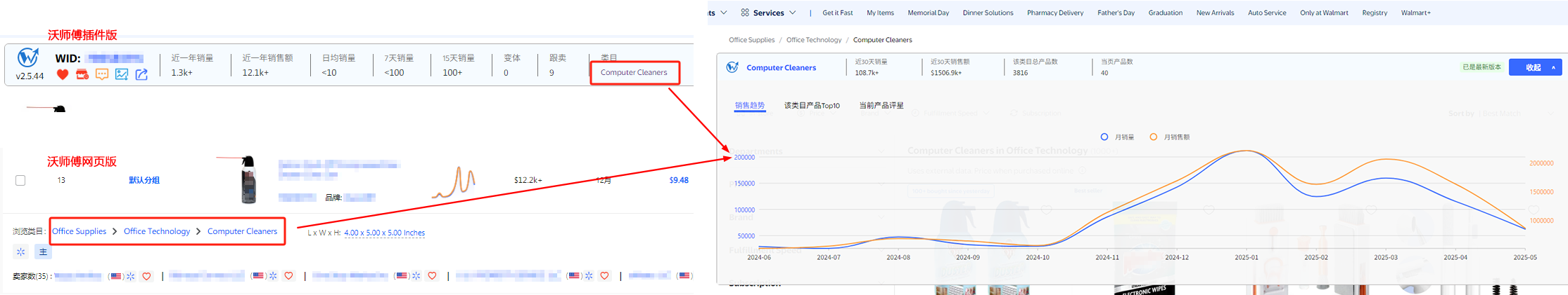 只有通过插件版商品详情页的类目或者沃师傅网页版的产品所属类目里跳转到沃尔玛搜索结果页面,才能够看到具体类目的数据,包括历史销售数据、总销量前10的产品及当前结果页面的产品星级评分。