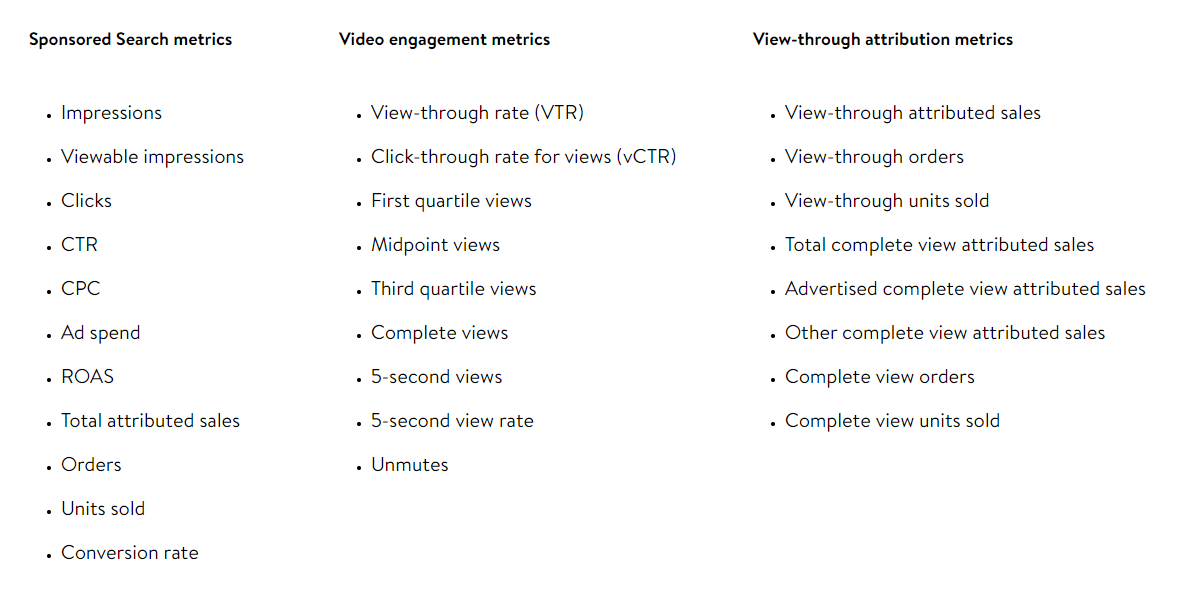 Sponsored Videos广告的指标除了我们在前两种广告里也见到的标准赞助搜索指标外,还有视频参与度指标、浏览归因指标,帮助广告主全面评估视频广告效果。