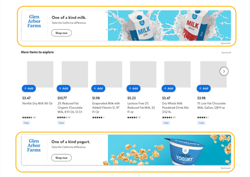 a. 它可以出现在沃尔玛的首页,通过一个或多个首页精选广告将您的品牌信息放在首位和中心位置,能在消费者访问沃尔玛平台时直接发现您的品牌。在桌面端,Onsite Display还能通过占据一至三个广告位,向消费者展示您的品牌故事,扩大品牌知名度。
